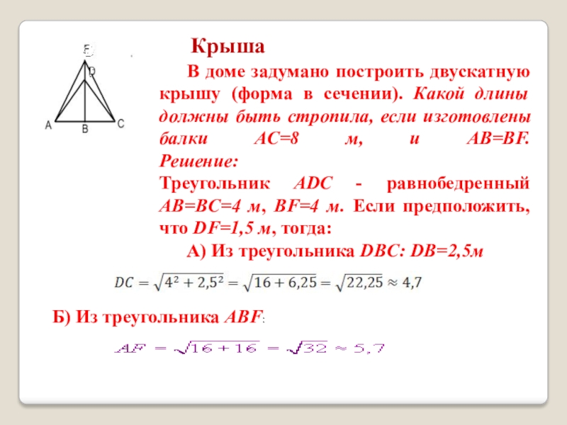 Слайд 18В доме задумано построить двускатную крышу (форма в сечении). Какой длины