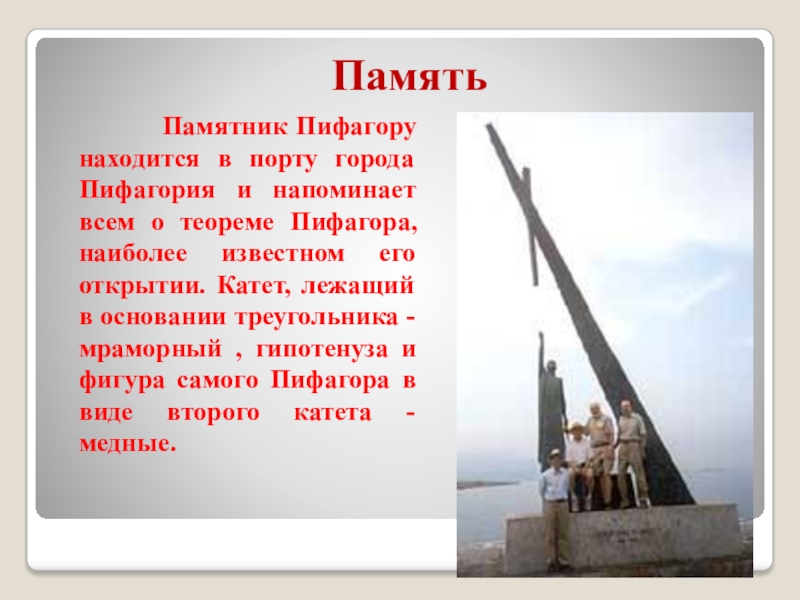 порту города Пифагория и напоминает всем о теореме Пифагора, наиболее известном его открытии. Катет, лежащий в основании треугольника - мраморный , гипотенуза и фигура самого Пифагора в виде второго катета - медные.
