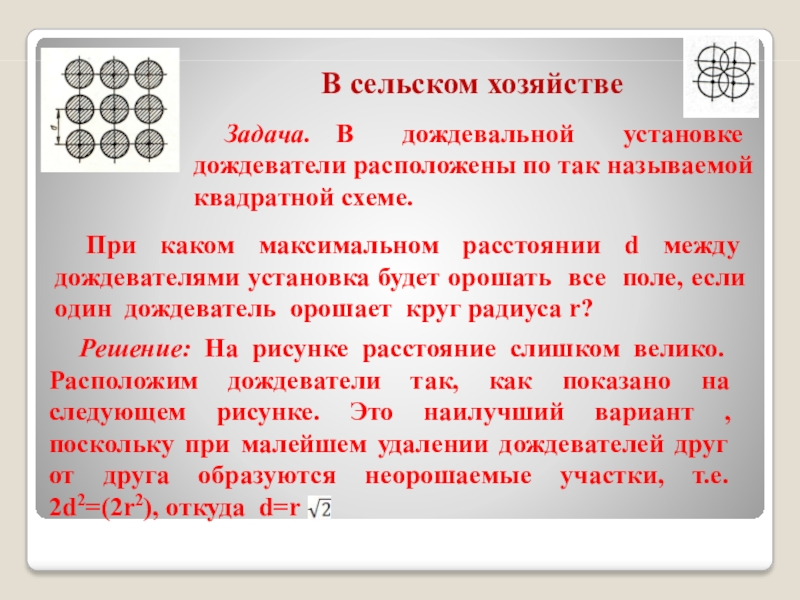Решение: На рисунке расстояние слишком велико. Расположим дождеватели так, как показано на следующем рисунке. Это наилучший вариант , поскольку при малейшем удалении дождевателей друг от друга образуются неорошаемые участки, т.е. 2d2=(2r2), откуда d=r