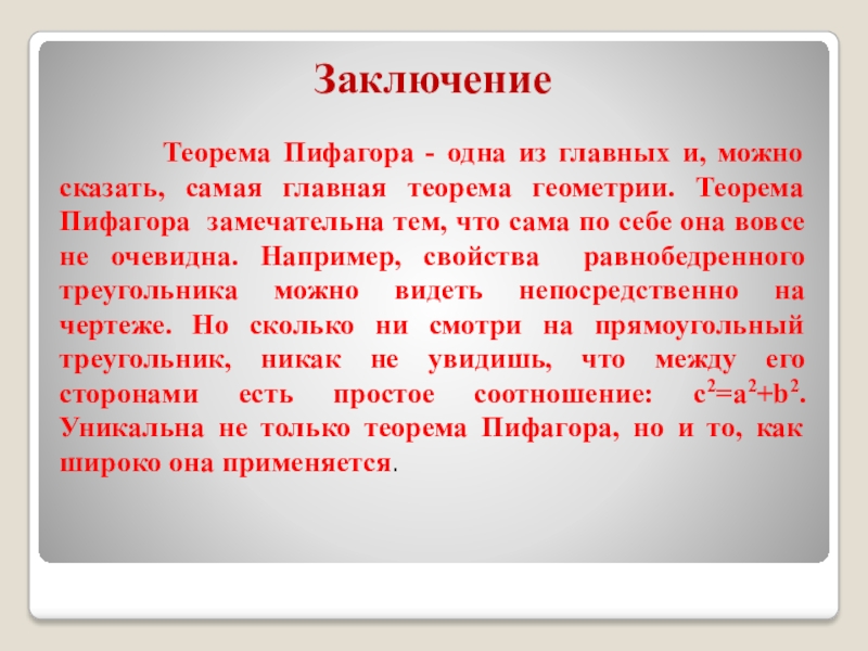 главных и, можно сказать, самая главная теорема геометрии. Теорема Пифагора замечательна тем, что сама по себе она вовсе не очевидна. Например, свойства равнобедренного треугольника можно видеть непосредственно на чертеже. Но сколько ни смотри на прямоугольный треугольник, никак не увидишь, что между его сторонами есть простое соотношение: c2=a2+b2. Уникальна не только теорема Пифагора, но и то, как широко она применяется.