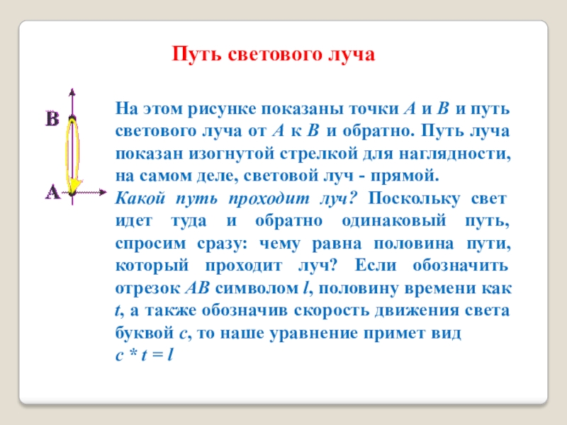 Какой путь проходит луч? Поскольку свет идет туда и обратно одинаковый путь, спросим сразу: чему равна половина пути, который проходит луч? Если обозначить отрезок AB символом l, половину времени как t, а также обозначив скорость движения света буквой c, то наше уравнение примет вид