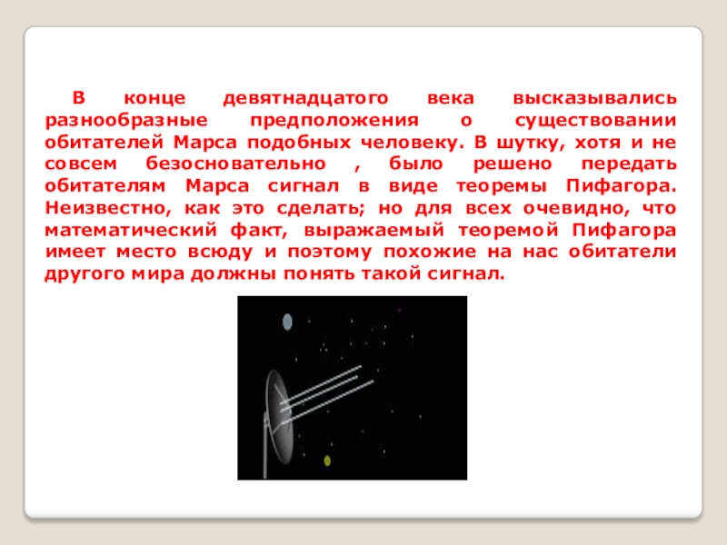 подобных человеку. В шутку, хотя и не совсем безосновательно , было решено передать обитателям Марса сигнал в виде теоремы Пифагора. Неизвестно, как это сделать; но для всех очевидно, что математический факт, выражаемый теоремой Пифагора имеет место всюду и поэтому похожие на нас обитатели другого мира должны понять такой сигнал.
