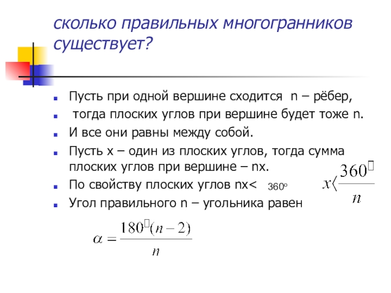 1. 60о * 3 = 180о < 360о , 4 грани - тетраэдр.