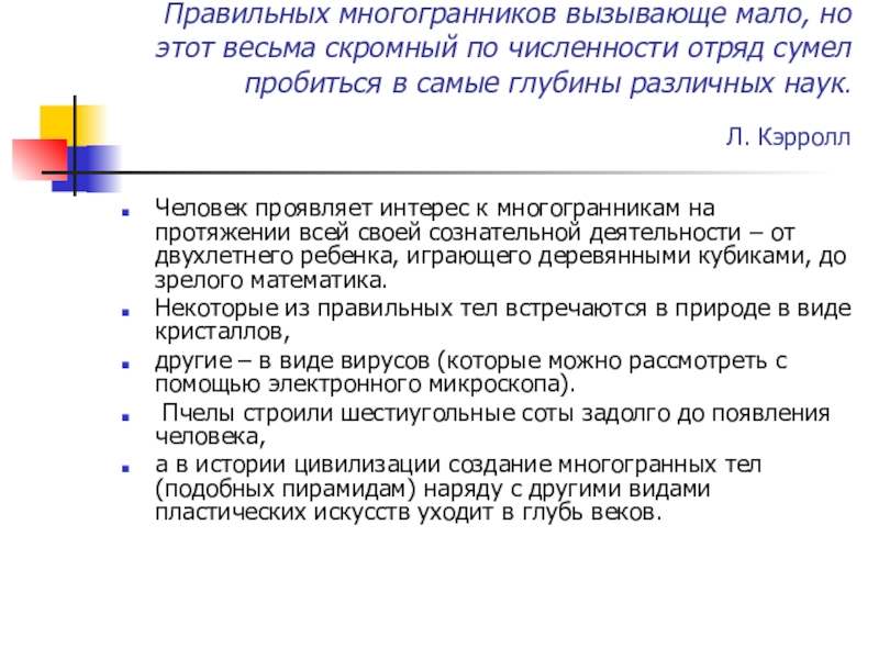 Человек проявляет интерес к многогранникам на протяжении всей своей сознательной деятельности – от двухлетнего ребенка, играющего деревянными кубиками, до зрелого математика.