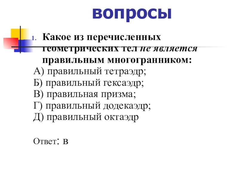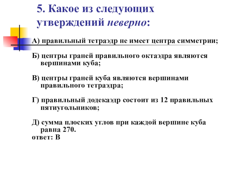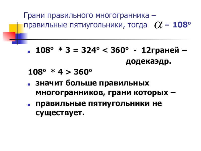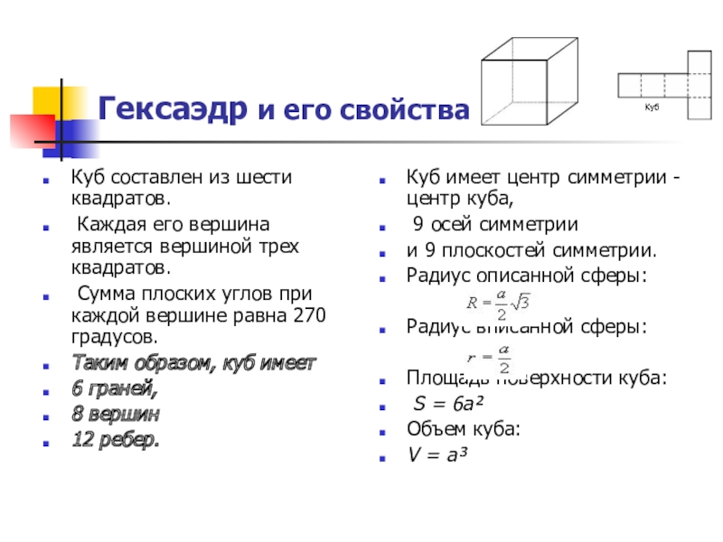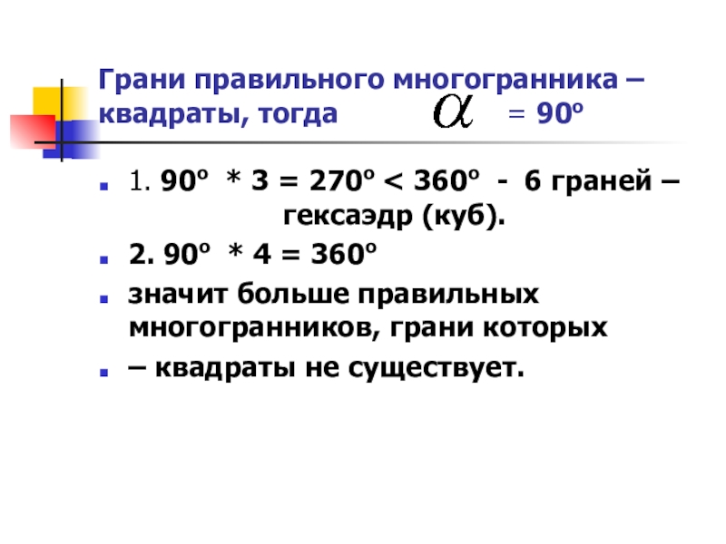 1. 90о * 3 = 270о < 360о - 6 граней – гексаэдр (куб).