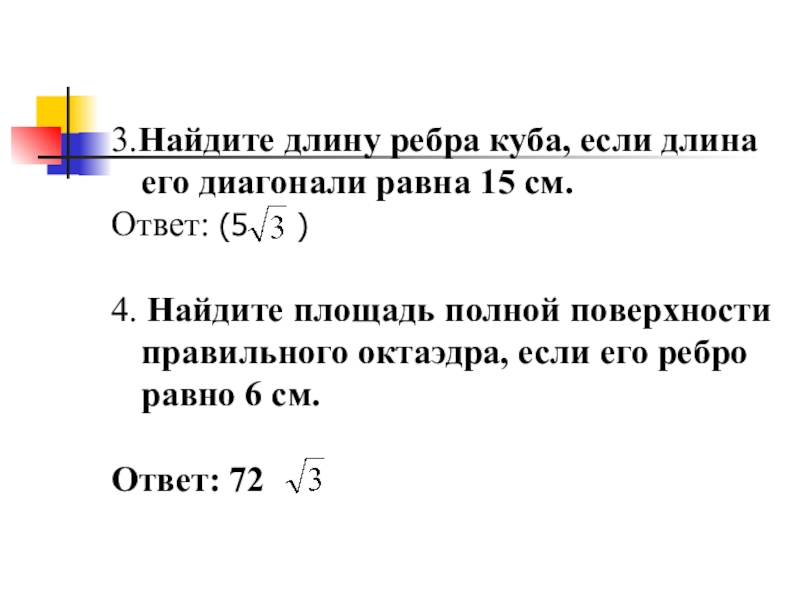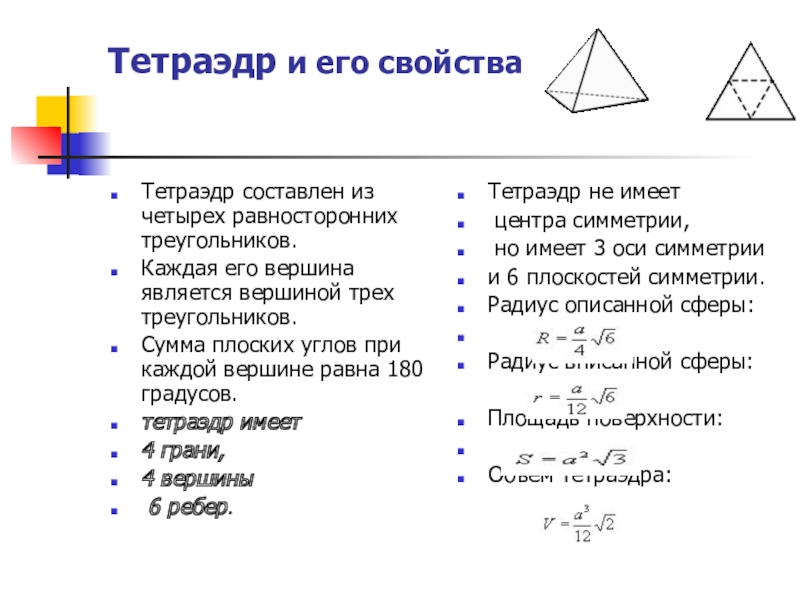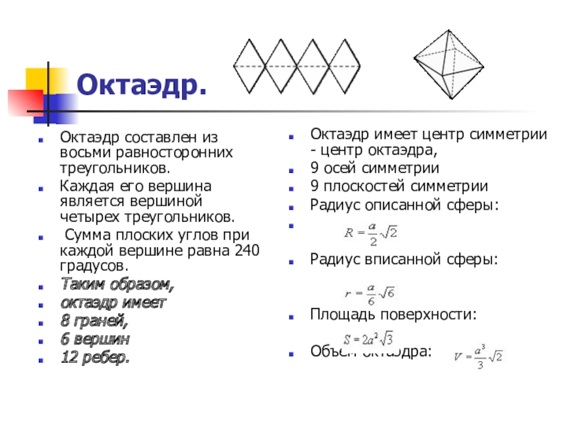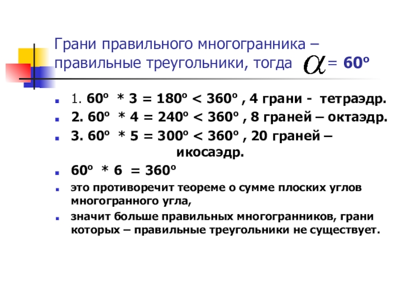 2. 60о * 4 = 240о < 360о , 8 граней – октаэдр.
