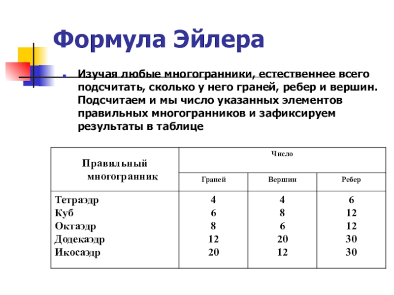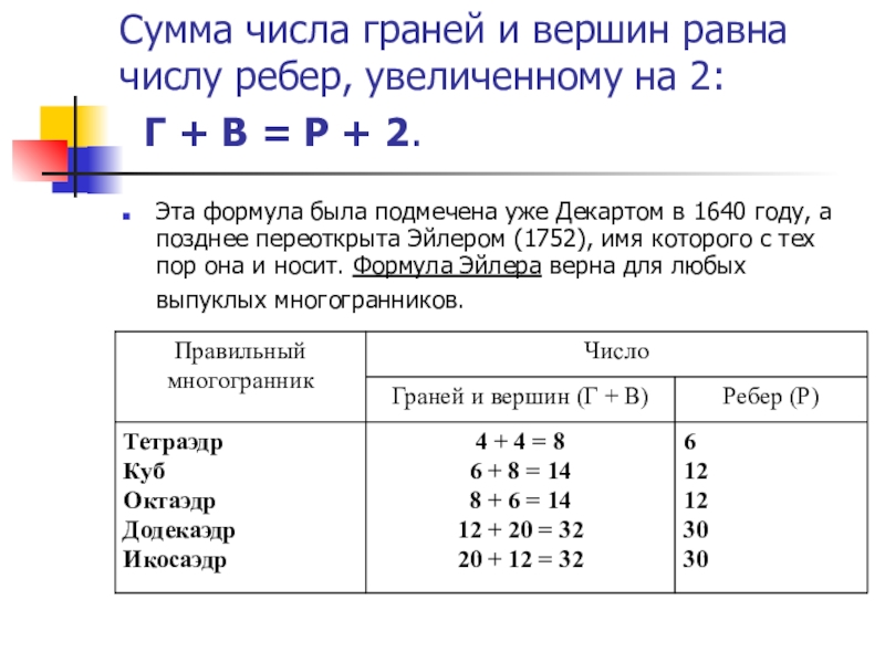 Эта формула была подмечена уже Декартом в 1640 году, а позднее переоткрыта Эйлером (1752), имя которого с тех пор она и носит. Формула Эйлера верна для любых выпуклых многогранников.
