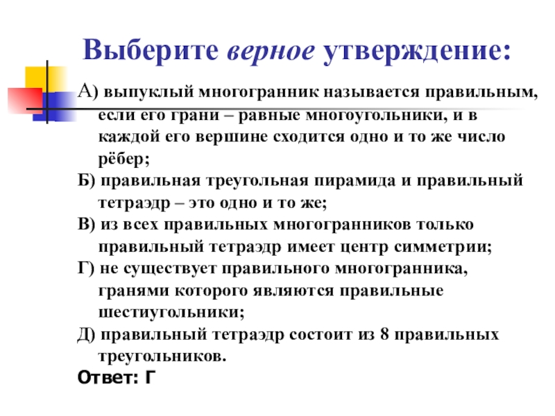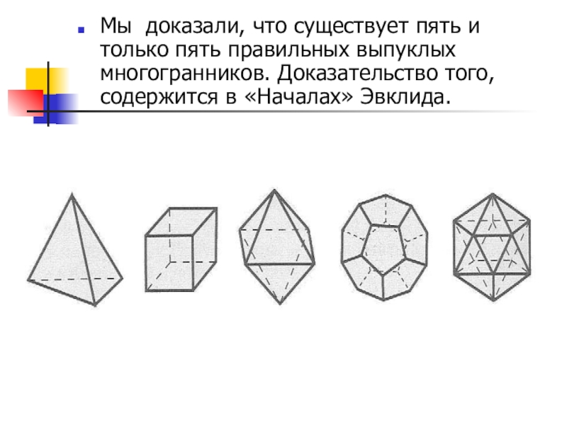 значит больше правильных многогранников, грани которых – правильные треугольники не существует.