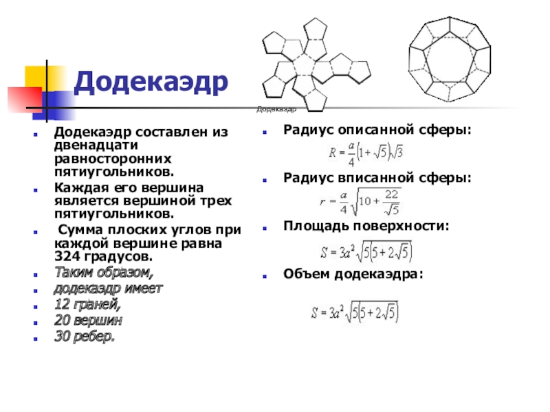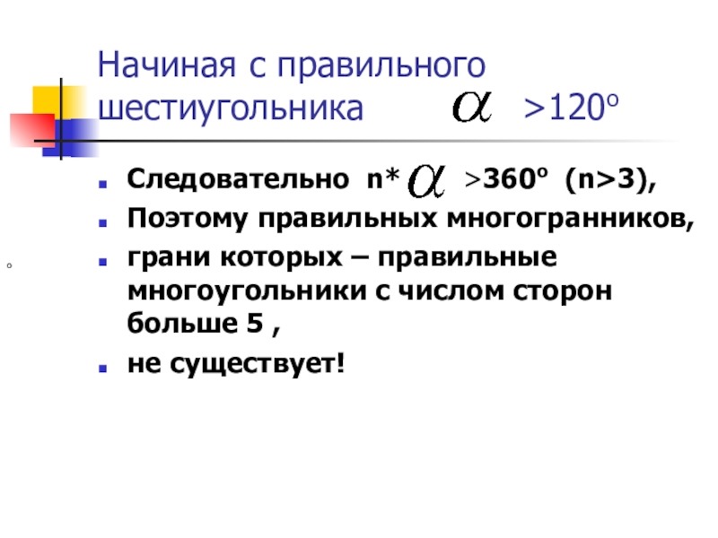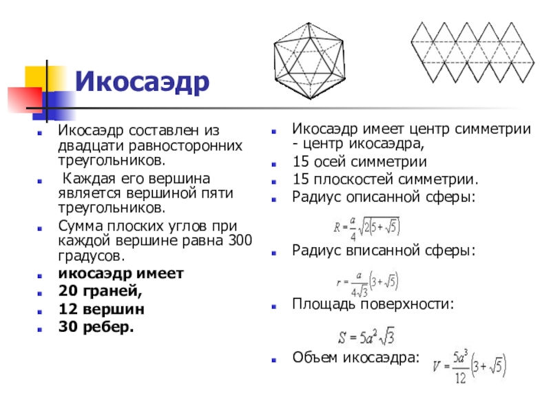3. 60о * 5 = 300о < 360о , 20 граней – икосаэдр.