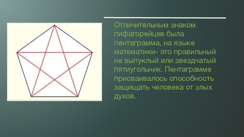 Слайд 4Отличительным знаком пифагорейцев была пентаграмма, на языке математики- это правильный не