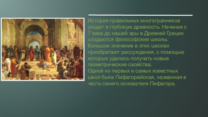 История правильных многогранников уходит в глубокую древность. Начиная с 7 века до нашей эры в Древней Греции