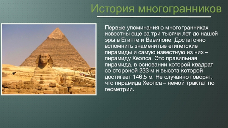 История многогранниковПервые упоминания о многогранниках известны еще за три тысячи лет до нашей эры в Египте и Вавилоне. Достаточно вспомнить знаменитые египетские пирамиды и самую известную из них – пирамиду Хеопса. Это правильная пирамида, в основании