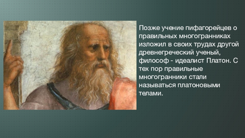Позже учение пифагорейцев о правильных многогранниках изложил в своих трудах другой древнегреческий ученый, философ - идеалист Платон.