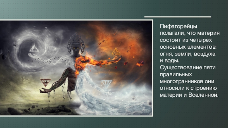 Слайд 5Пифагорейцы полагали, что материя состоит из четырех основных элементов: огня, земли,