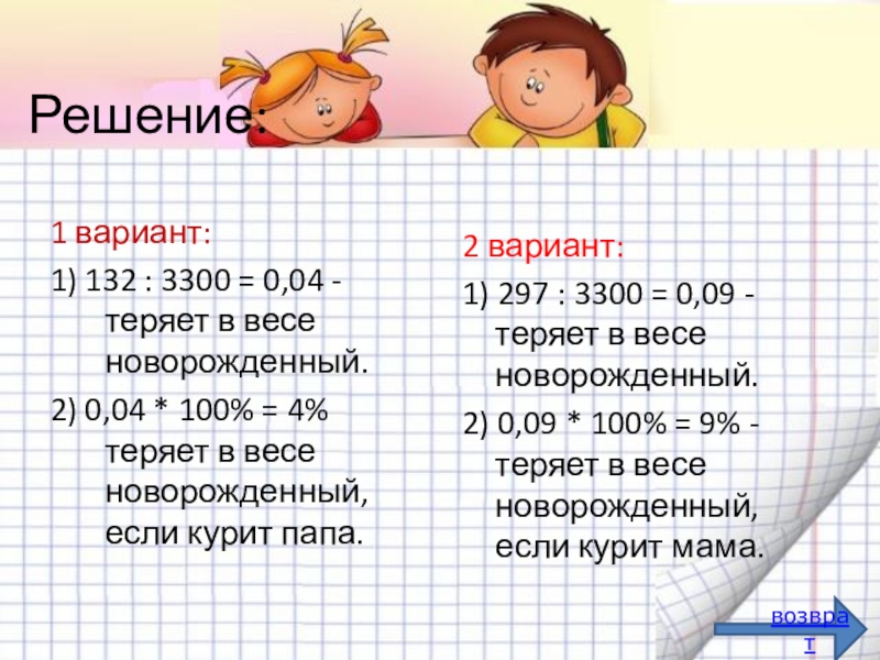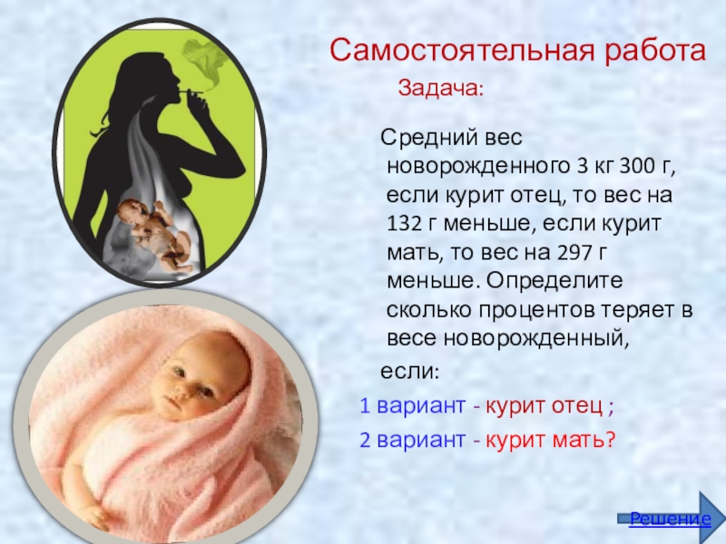 Средний вес новорожденного 3 кг 300 г, если курит отец, то вес на 132 г меньше, если курит мать, то вес на 297 г меньше. Определите сколько процентов теряет в весе новорожденный,