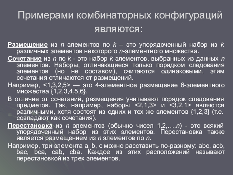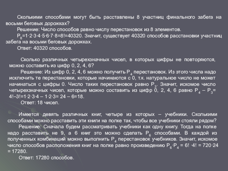 Решение: Сначала будем рассматривать учебники как одну книгу. Тогда на полке надо расставить не 9, а 6 книг это можно сделать Р6 способами. В каждой из полученных комбинаций можно выполнить Р4 перестановок учебников. Значит, искомое число способов расположения книг на полке равно произведению Р6·Р4 = 6! ·4! = 720·24 = 17280.
