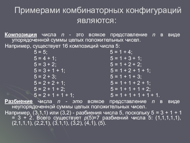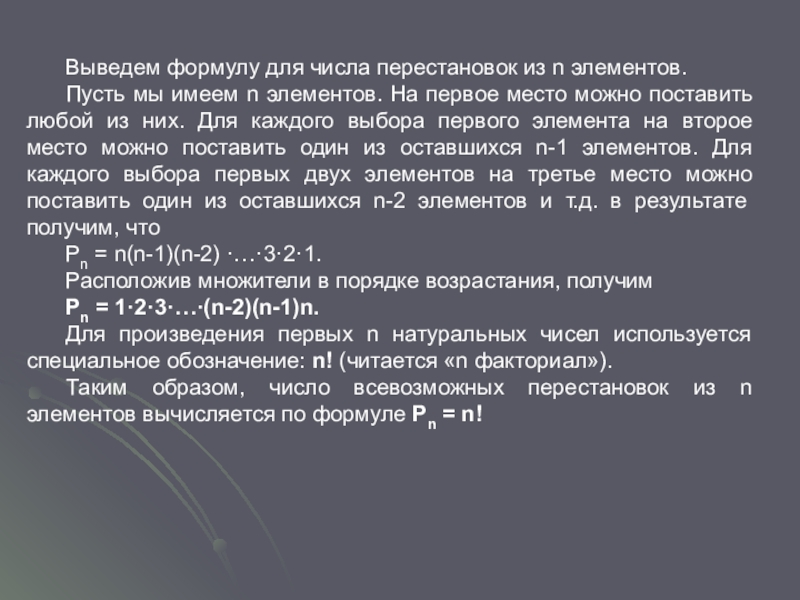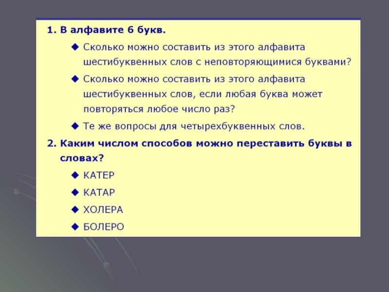 Решение: Рассмотрим алгебру и геометрию как один урок. Тогда расписание надо составить не из 6, а из 5 уроков – Р5 способов. В каждой из полученных комбинаций можно выполнить Р2 перестановки алгебры и геометрии. Значит, искомое число способов составления расписания: