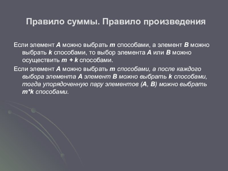 Решение: Брюки можно выбрать пятью способами, камзолы – шестью, шляпы – тремя, сапоги – двумя. Значит, костюм можно составить 5·6·3·2=180 способами.