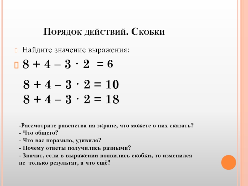 - Значит, если в выражении появились скобки, то изменился не только результат, а что ещё?