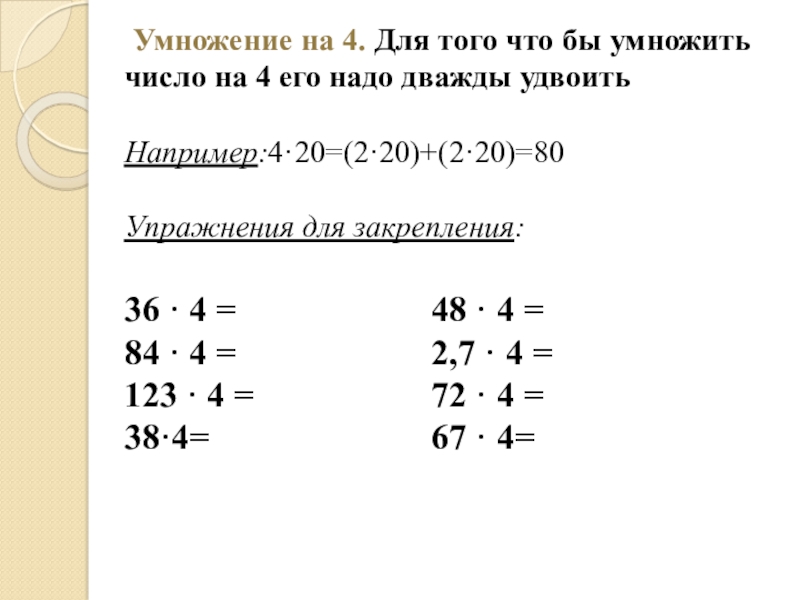 Слайд 14 Умножение на 4. Для того что бы умножить число на