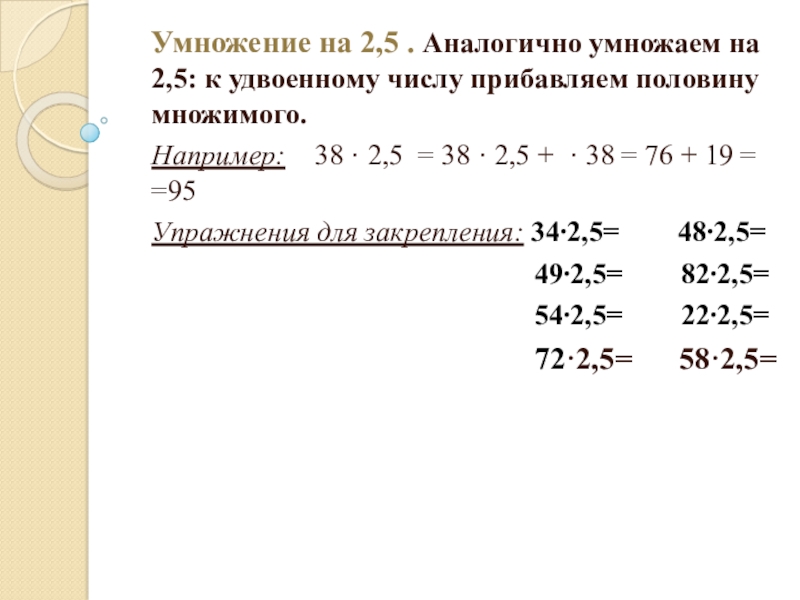 Слайд 21Умножение на 2,5 . Аналогично умножаем на 2,5: к удвоенному числу