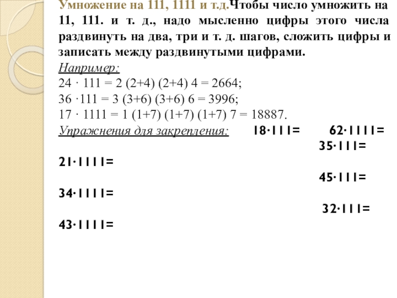 Слайд 11Умножение на 111, 1111 и т.д.Чтобы число умножить на 11, 111.