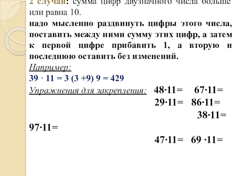 Слайд 102 случай: сумма цифр двузначного числа больше или равна 10.