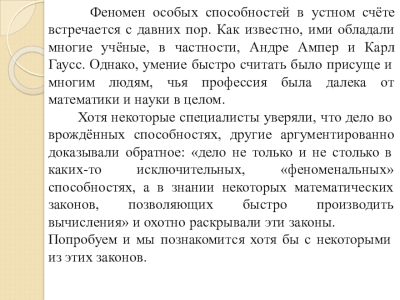 давних пор. Как известно, ими обладали многие учёные, в частности, Андре Ампер и Карл Гаусс. Однако, умение быстро считать было присуще и многим людям, чья профессия была далека от математики и науки в целом.