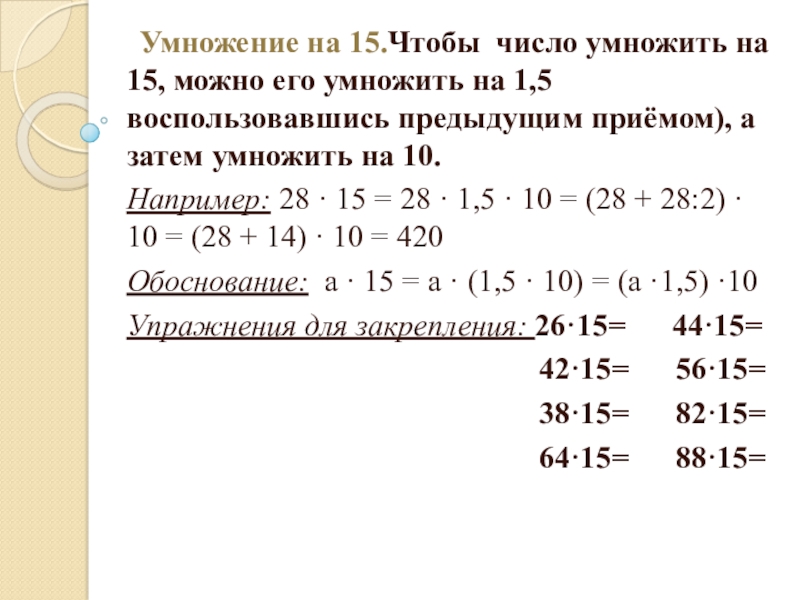 Например: 28 · 15 = 28 · 1,5 · 10 = (28 + 28:2) · 10 = (28 + 14) · 10 = 420
