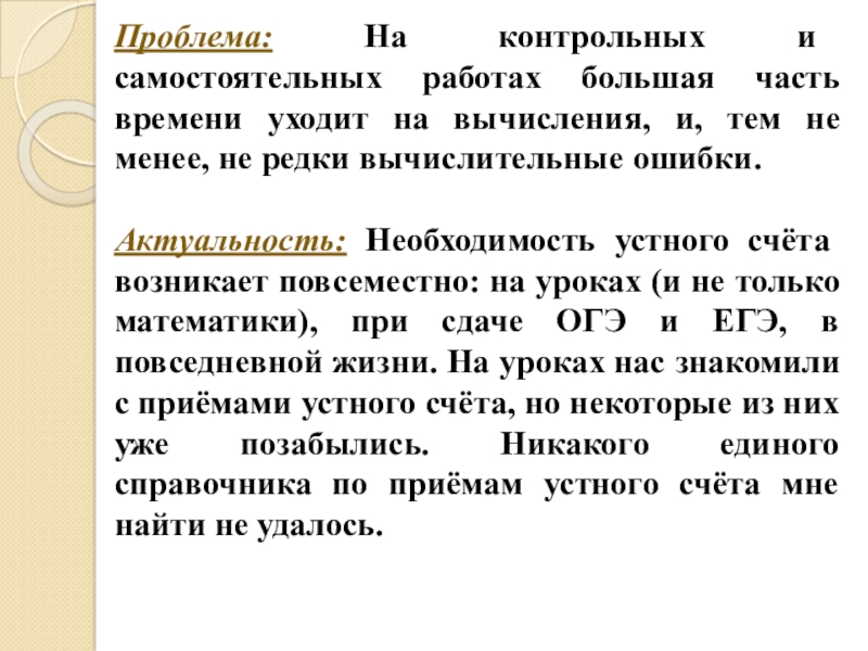 Актуальность: Необходимость устного счёта возникает повсеместно: на уроках (и не только математики), при сдаче ОГЭ и ЕГЭ, в повседневной жизни. На уроках нас знакомили с приёмами устного счёта, но некоторые из них уже позабылись. Никакого единого справочника по приёмам устного счёта мне найти не удалось.