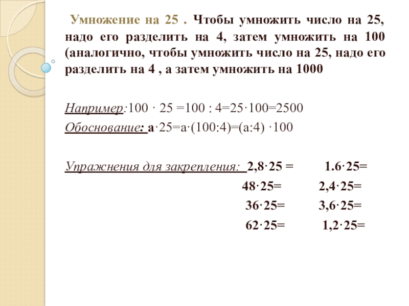 Слайд 22 Умножение на 25 . Чтобы умножить число на 25, надо