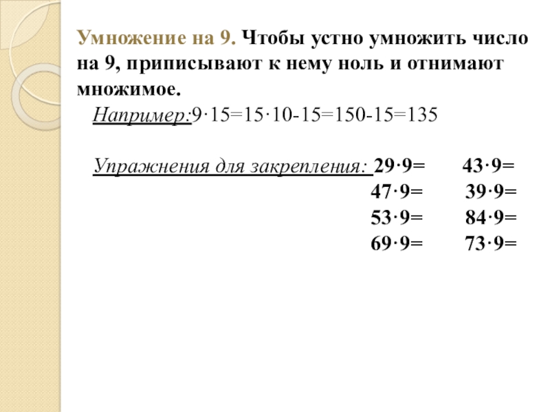 Слайд 16Умножение на 9. Чтобы устно умножить число на 9, приписывают к