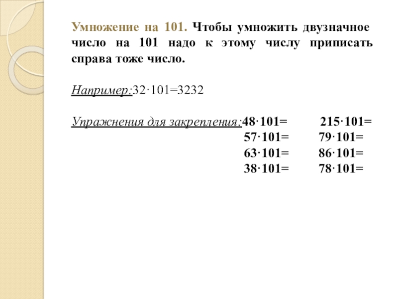 Слайд 15Умножение на 101. Чтобы умножить двузначное число на 101 надо к
