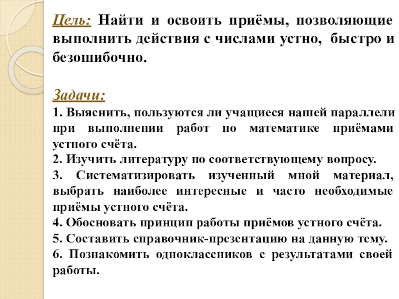 Слайд 3Цель: Найти и освоить приёмы, позволяющие выполнить действия с числами устно,