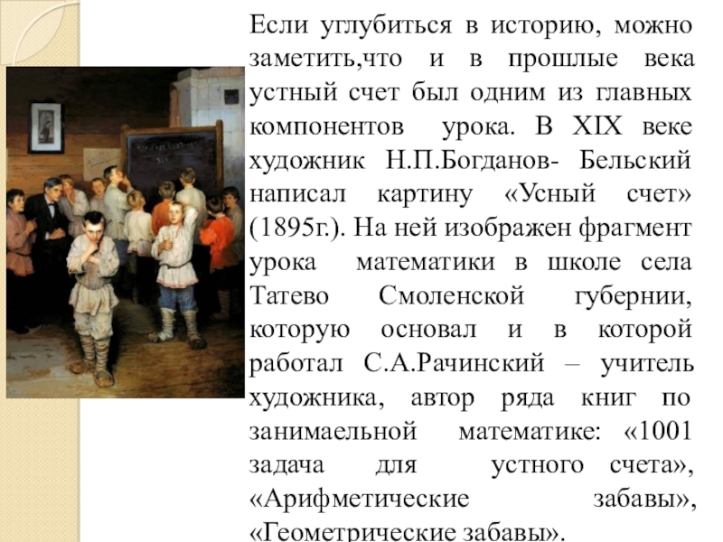 счет был одним из главных компонентов урока. В XIX веке художник Н.П.Богданов- Бельский написал картину «Усный счет»(1895г.). На ней изображен фрагмент урока математики в школе села Татево Смоленской губернии, которую основал и в которой работал С.А.Рачинский – учитель художника, автор ряда книг по занимаельной математике: «1001 задача для устного счета», «Арифметические забавы», «Геометрические забавы».