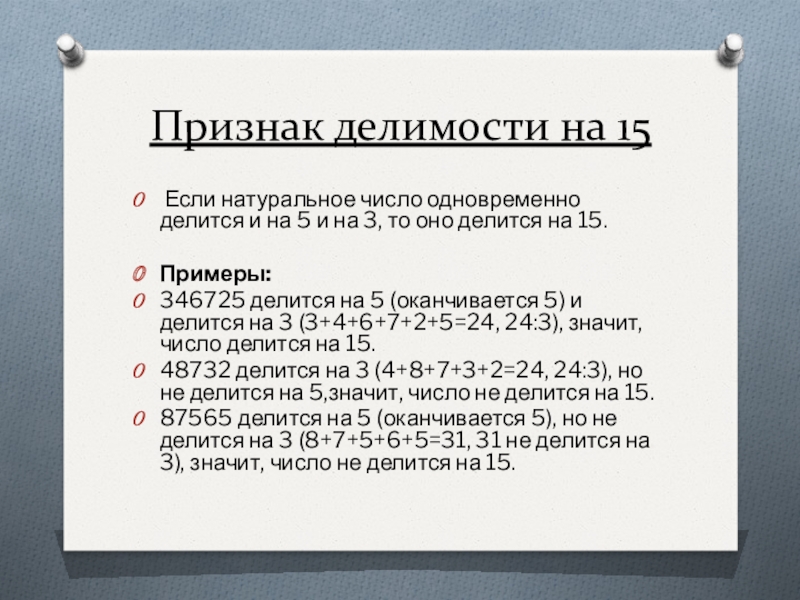 87565 делится на 5 (оканчивается 5), но не делится на 3 (8+7+5+6+5=31, 31 не делится на 3), значит, число не делится на 15.