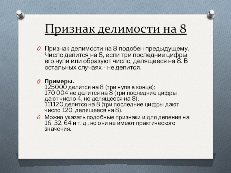 Можно указать подобные признаки и для деления на 16, 32, 64 и т. д., но они не имеют практического значения.