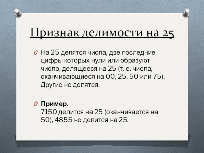 нули или образуют число, делящееся на 25 (т. е. числа, оканчивающиеся на 00, 25, 50 или 75). Другие не делятся.