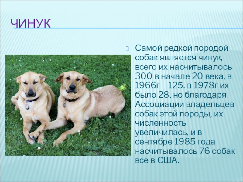 ЧИНУКСамой редкой породой собак является чинук, всего их насчитывалось 300 в начале 20 века, в 1966г –