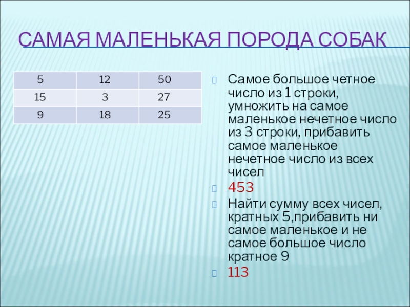 САМАЯ МАЛЕНЬКАЯ ПОРОДА СОБАКСамое большое четное число из 1 строки, умножить на самое маленькое нечетное число из