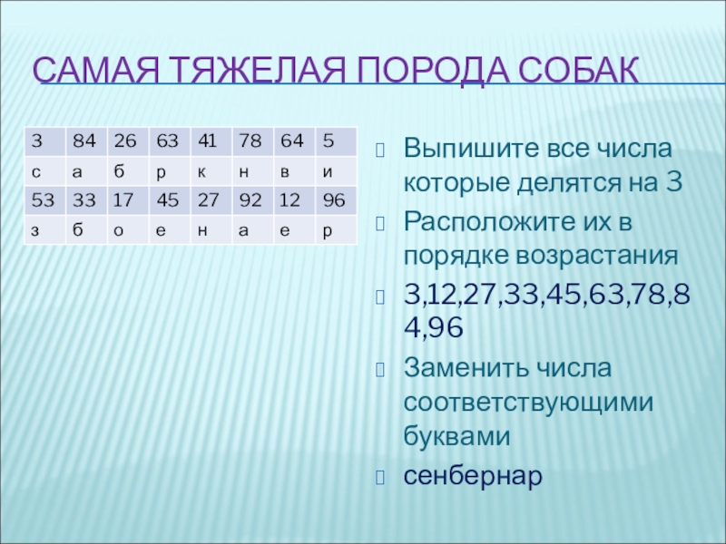 САМАЯ ТЯЖЕЛАЯ ПОРОДА СОБАКВыпишите все числа которые делятся на 3Расположите их в порядке возрастания3,12,27,33,45,63,78,84,96Заменить числа соответствующими буквамисенбернар