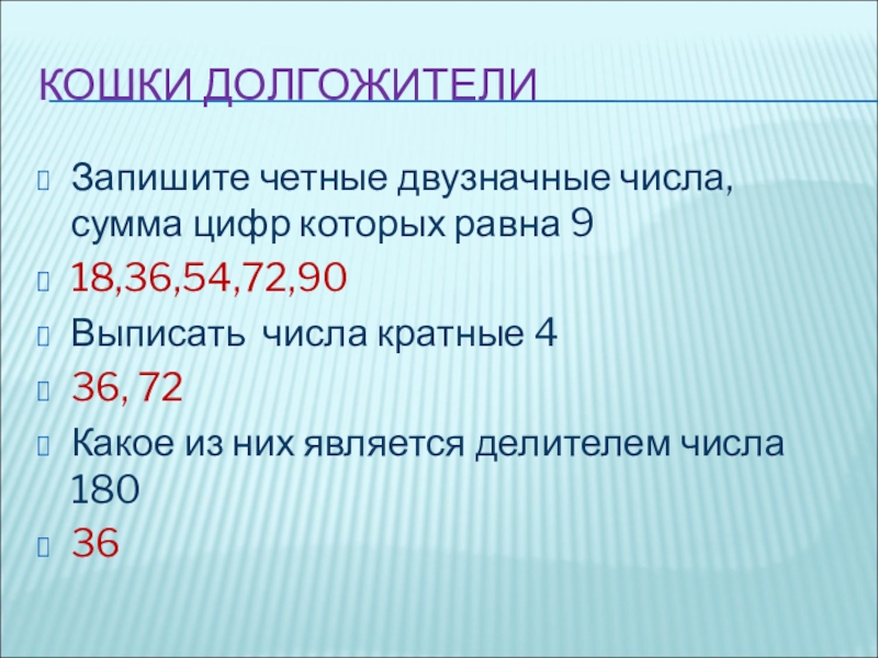 КОШКИ ДОЛГОЖИТЕЛИЗапишите четные двузначные числа, сумма цифр которых равна 918,36,54,72,90Выписать числа кратные 436, 72Какое из них является