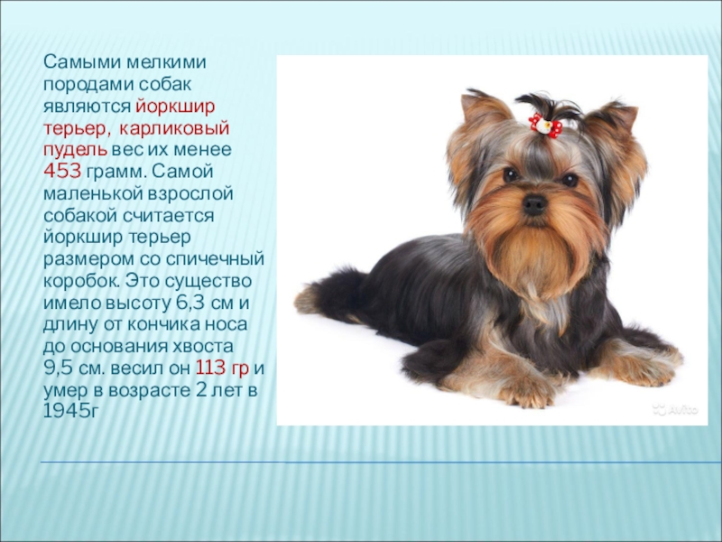 менее 453 грамм. Самой маленькой взрослой собакой считается йоркшир терьер размером со спичечный коробок. Это существо имело высоту 6,3 см и длину от кончика носа до основания хвоста 9,5 см. весил он 113 гр и умер в возрасте 2 лет в 1945г