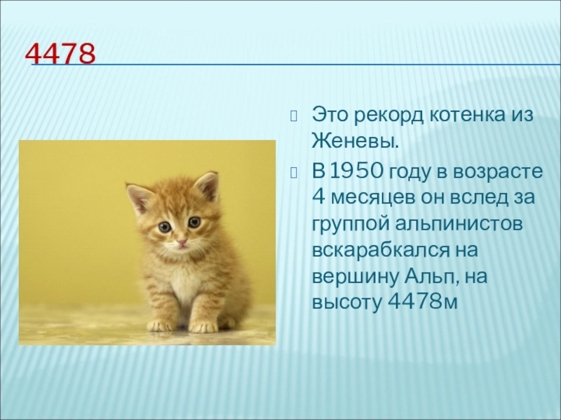4478Это рекорд котенка из Женевы.В 1950 году в возрасте 4 месяцев он вслед за группой альпинистов вскарабкался