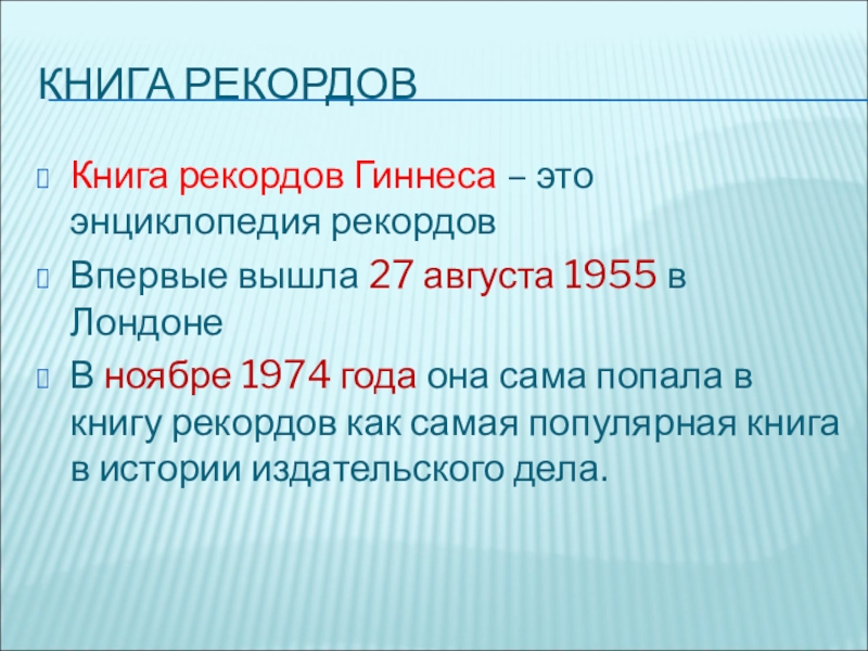 КНИГА РЕКОРДОВКнига рекордов Гиннеса – это энциклопедия рекордовВпервые вышла 27 августа 1955 в ЛондонеВ ноябре 1974 года она сама попала в книгу рекордов как самая популярная книга в истории издательского дела.