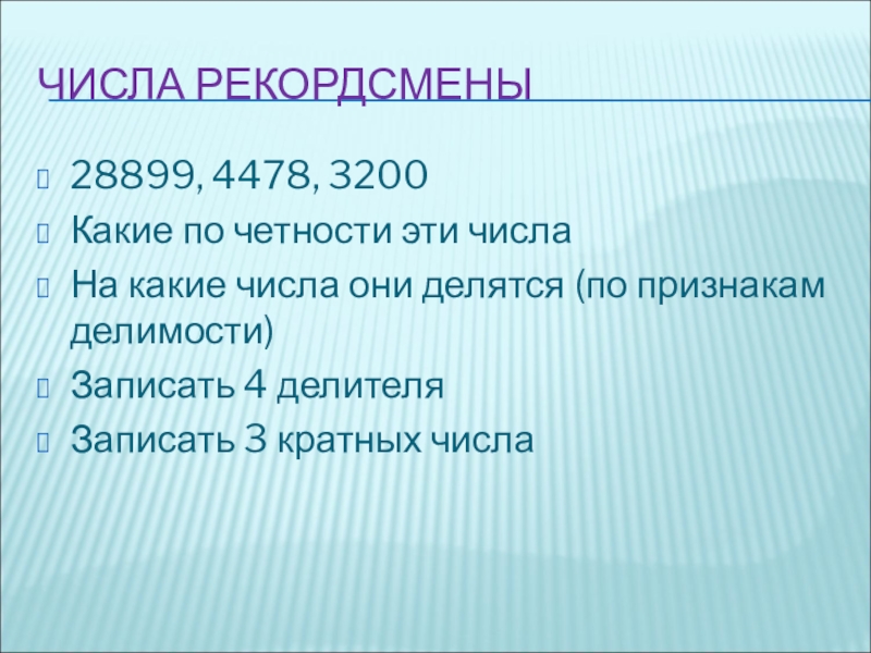 ЧИСЛА РЕКОРДСМЕНЫ28899, 4478, 3200Какие по четности эти числаНа какие числа они делятся (по признакам делимости)Записать 4 делителяЗаписать