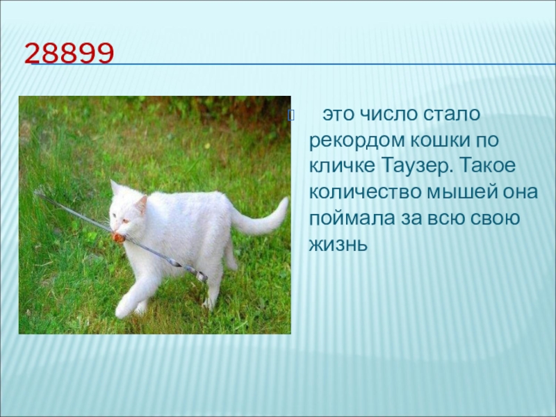28899  это число стало рекордом кошки по кличке Таузер. Такое количество мышей она поймала за всю