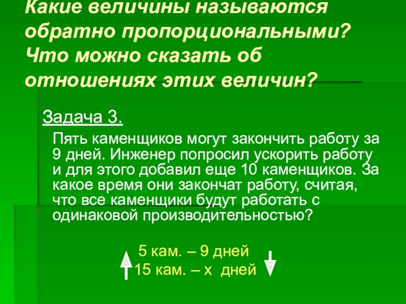 Пять каменщиков могут закончить работу за 9 дней. Инженер попросил ускорить работу и для этого добавил еще 10 каменщиков. За какое время они закончат работу, считая, что все каменщики будут работать с одинаковой производительностью?