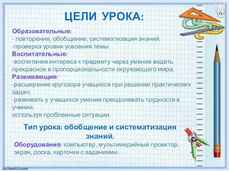 Оборудование: компьютер, мультимедийный проектор, экран, доска, карточки с заданиями.