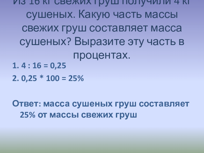Ответ: масса сушеных груш составляет 25% от массы свежих груш
